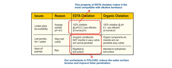 Coffee board recommends that bordeaux mixture prepared should be alkaline in nature (pH 9 to 10) for maximum efficacy.* Alkaline bordeaux mixture has several beneficial effects such as good retention of foliage,slow weathering of copper from spray deposit, prolonged persistence and increased yield.*FolChel EDTA chelates are the most stable chelates in alkaline pH. To be effective EDTA salts need to be used with suitable surfactants.