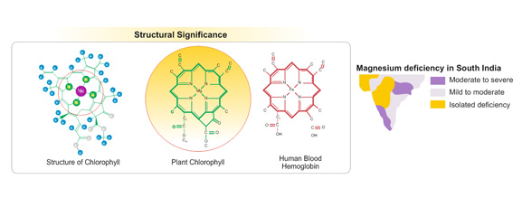 Central atom in chlorophyll is magnesium similar to the hemoglobin structure where the central atom of hemoglobin is iron. Magnesium has a big role as the central building block in chlorophyll and is important for chlorophyll stabilization and biosynthesis. Plants under high light conditions have a higher physiological requirement for Magnesium. Zinc is associated with the formation of chlorophyll. It is involved in several enzyme systems and is essential for protein synthesis.